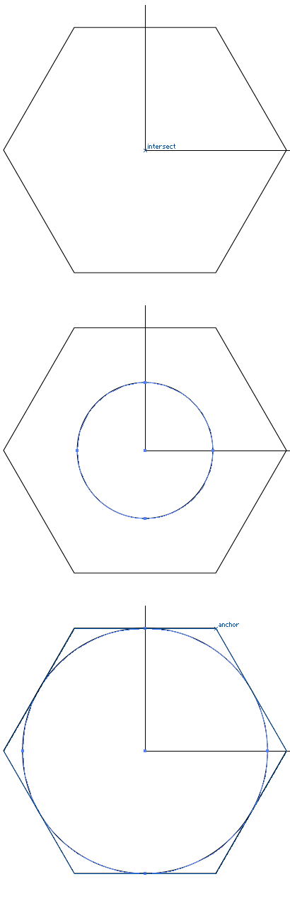 Az4r14h Feb 10, 2014 11:05 AM (in response to Jacob Bugge)This answer is close.But with a hexagon that has a radius of 400, I need a circle that touches the midpoint of one the the sides and not the corner. Here is a picture. It seems that after playing with the image I can use the intersecting point (using smart guides) to draw a radius between the two small red circles. But I was really hoping to find a faster way to create the circle without drawing extra lines. I guess the "castle in the sky" reference is somewhat true regarding my expectations after the price of the software (que les Miserables soundtrack). But I'm really loving being able to put some of my artwork into vector form. Here's a picture of what I mean.. I want to create a radius between the two red circles. Thanks for the help.